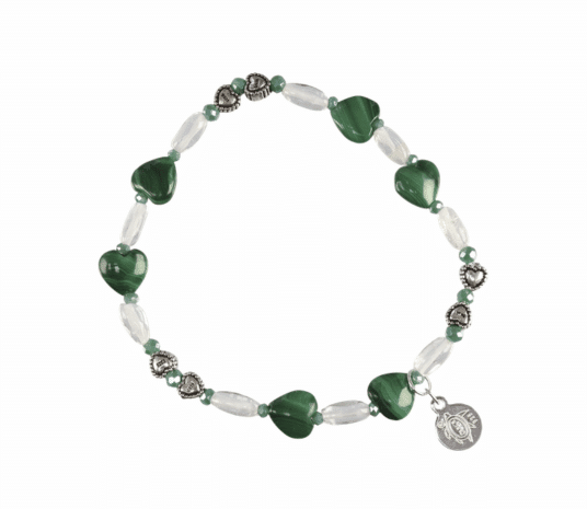 La pulsera de corazones de malaquita y cuarzo combina la fuerza transformadora de la malaquita con la energía equilibrante del cuarzo, creando una pieza pensada para acompañarte en procesos emocionales y de crecimiento.